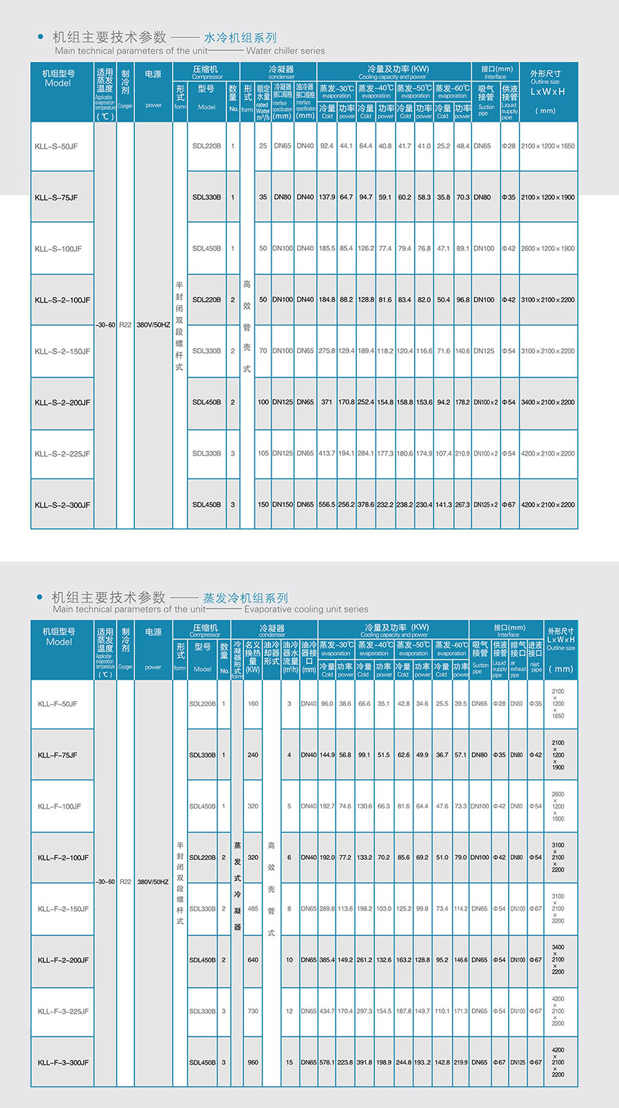 由於單級壓縮(suō)的低溫螺杆機組對於較低溫度的應 用時,存在能效比不高、蒸發溫(wēn)度範圍較窄等缺 陷,本(běn)公司推出的低溫(wēn)雙段螺杆機組,可滿足較(jiào) 低(dī)溫度的速(sù)凍(dòng)隧道及速凍(dòng)庫使用。